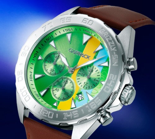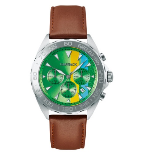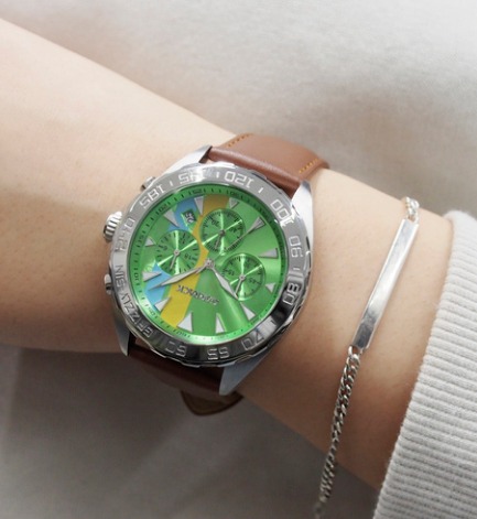 神器のグリーン、服のオレンジと水色を文字盤に、髪のブラウンをベルトに採用しています。