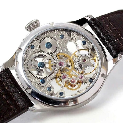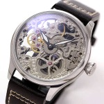 こちらも手巻きムーブメントかつシースルーバックで、動く様子が裏蓋から見られます。