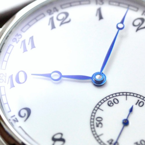 陶器のようになめらかなホワイトカラー文字盤に、青い針とブラックのアラビアンインデックスが映えます。