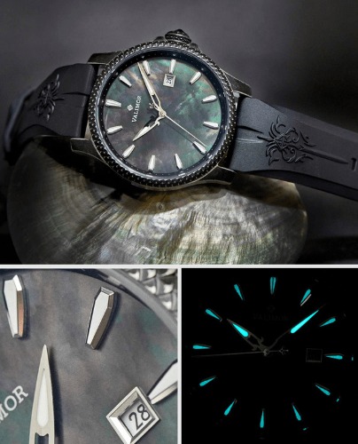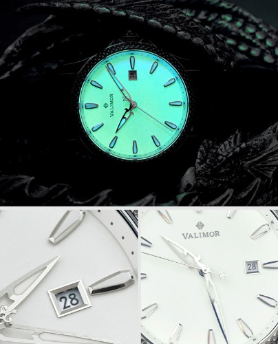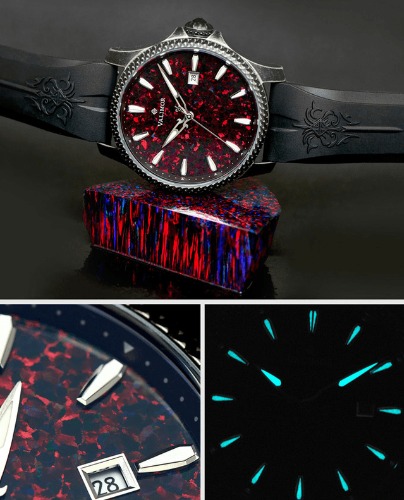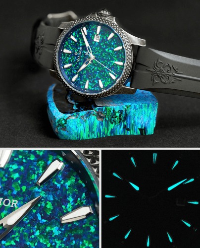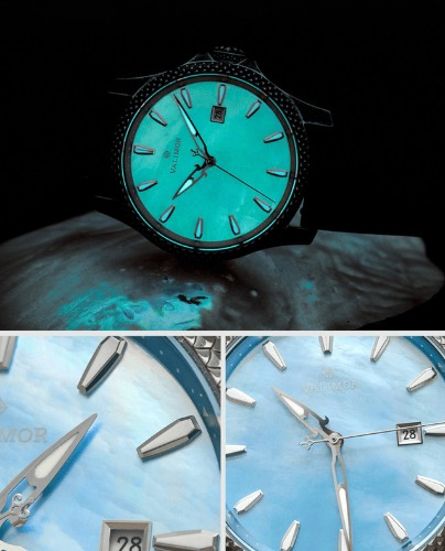 こちらは暗闇で文字盤全体がオーロラのように輝きます。