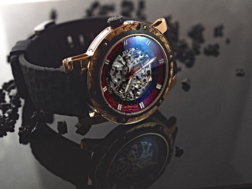 特殊加工されたドーム型のサファイアガラスから見えるムーブメントの動きを眺めていると、文字盤の美しさとともに心が癒されるでしょう。