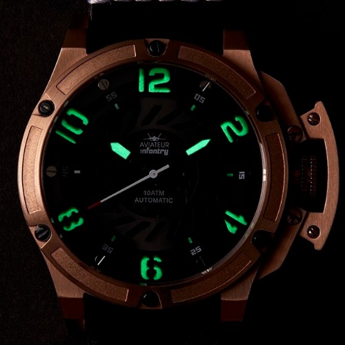 ネジで頑丈に留められたケース、大きめのリューズとリューズガード、プロペラのようなダイヤルが戦闘機の機体を表現しています。