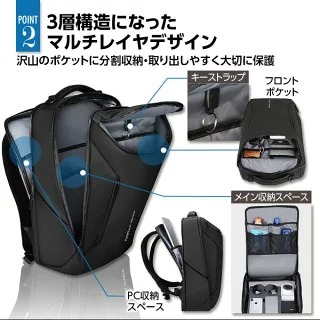 荷物の多いメンズ向けというだけでなく、左右非対称なデザインが魅力的なビジネスリュックです。