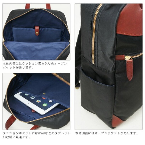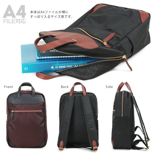 評価:背負えるタイプのおしゃれなもの、お弁当や水筒、PCをいれても不格好に膨らまない。色は黒茶ですが、スーツでも全く違和感なし。