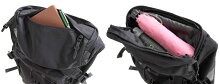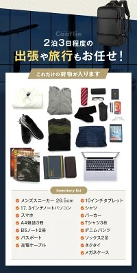 評価:着替や整髪料などの小物、モバイルパソコン、ノートとシステム手帳、傘あたりが大きめの荷物ですが、十分入ります。