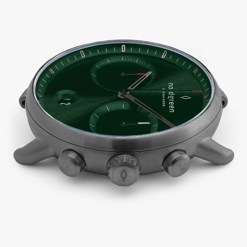 ノードグリーンPioneer(パイオニア)はグリーンの文字盤に、スモールセコンドとストップウォッチ針先のオレンジがアクセントになっています。