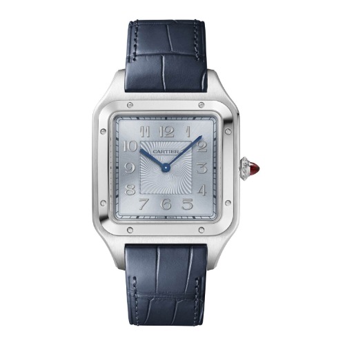 ブルーまたはレッドのパール状の飾り付きリューズがあしらわれており、カルティエのデザインコードを反映しています。