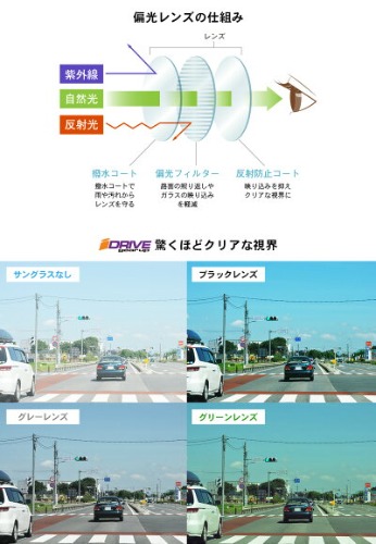 また偏光機能により路面の照り返しを抑えることで、白線やオレンジ線を強調し車線の中での自車位置把握がしやすくなり、レ一ンキープの容易さにもつながります。