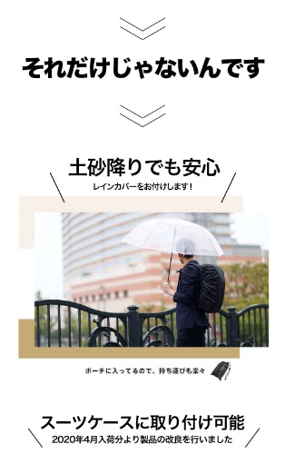 ビジネス用のリュックの場合、完全防水の商品はあまりありませんが、水をはじく商品だと中まで濡れるのに時間がかかるので安心です。