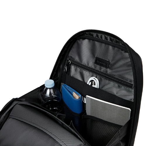 外側のポケットは、カードやペンフォルダーを細かく管理でき、350mlのペットボトルや折り畳み傘を収納できる耐水仕様のジップポケットもあります。