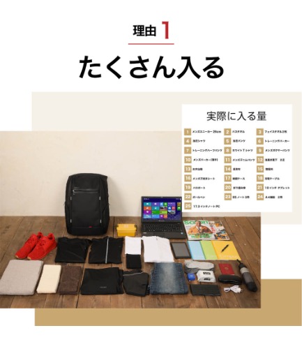 リュックだとすべてを収納できるので別途カバンを持つ必要もありません。