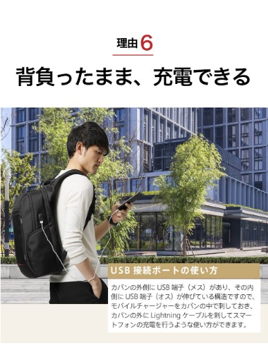 カバンの外側にはUSB端子(メス)があり内側にオスがあるため、モバイルチャージャーをカバンの中にさしたまま、外でスマホなどの充電ができます。