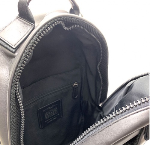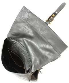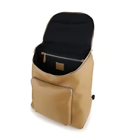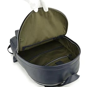 フラップタイプのレザーリュックで、大きな荷物を取り出したいときには、蓋全体のファスナーを開け、そうでないときには蓋の真ん中部分についているファスナーを開けて荷物を取り出せます。