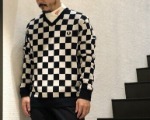 ビームスゴルフのチェッカーフラッグ Vネック セーターをブラックのパンツに合わせて、ストリートスタイルに仕上げています。