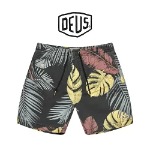 丈が短めのボードショーツと柄シャツのコーデで、すっきりとした印象も与えます。