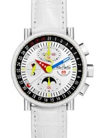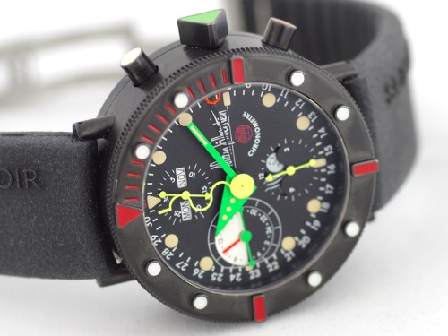 クロノグラフ・24時間表示・デイデイト表示を他には真似のできないデザインで立体化し、三角柱竜頭(リューズ)が絶妙なアクセントを与えています。