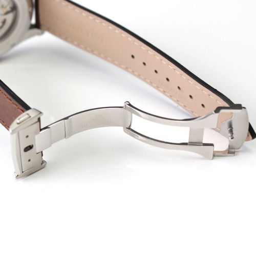 評価:クロノグラフと迷いましたが、仕事でも使うのでシンプルな方にしました。レザーベルトは最初固いですが徐々に馴染んでくると思います。ブレスがバタフライバックルなので、レザーベルトでも傷みにくいですし、公私共に長く使えそうです。