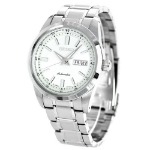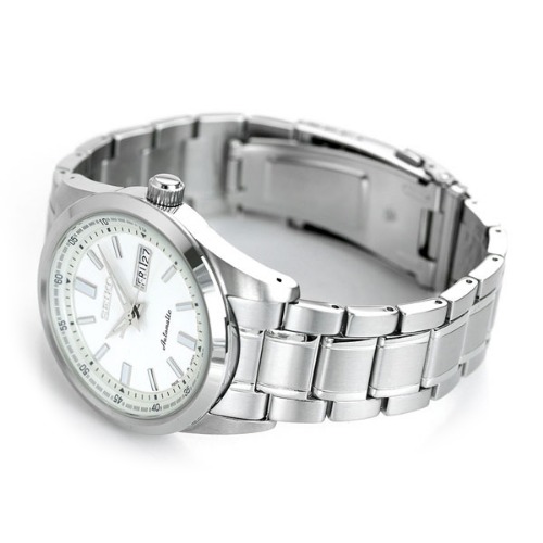 ケースとバンドにステンレスが使用されていて、文字盤のホワイトがとても美しいシンプルな3針のモデルです。