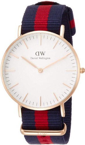ダニエルウェリントンのレディースに人気がある腕時計ランキング6位のCLASSIC OXFORD DW00100029は、ゴールドのインデックスや針に、赤と青のナイロンベルトが印象的なモデルです。