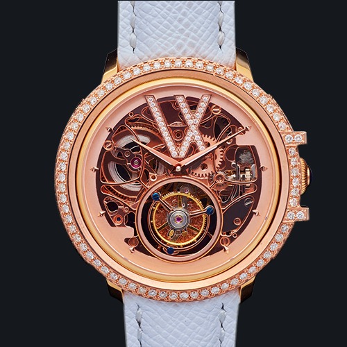 斬新なデザインが特徴的ですが、18Kローズゴールド製である上に、バゲットカット のダイヤモンドが408個も散りばめられている豪華な腕時計です。