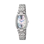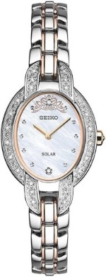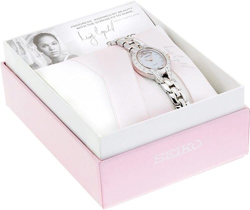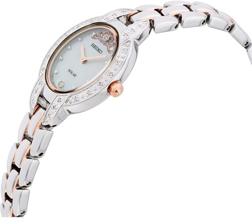 続いて紹介するのはきらびやかなデザインが目を惹くセイコーSUP283で、こちらは日常生活防水を備えたモデルであり、素材にマザーオブオパールやハードレッククリスタルを使用しています。