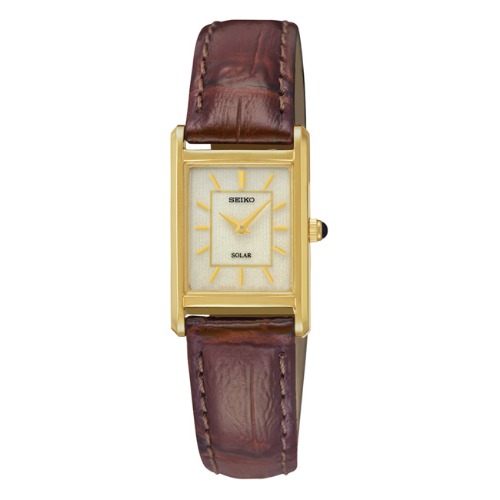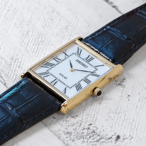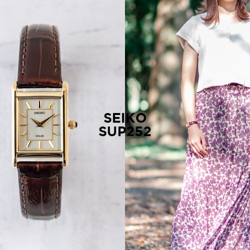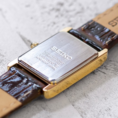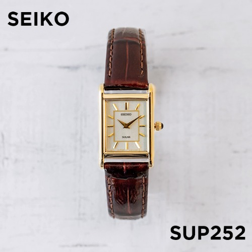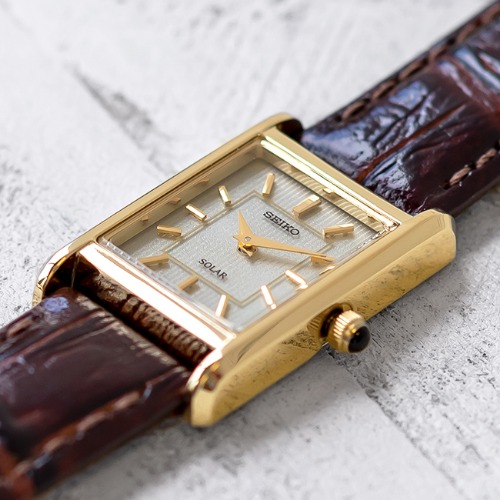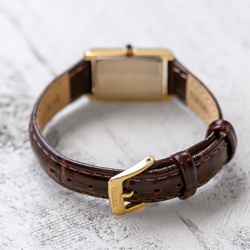 女性の華奢な手首を上品に飾る腕時計として注目して欲しいのがセイコーSUP252で、革ベルトの色合いと絶妙にマッチしたシャンパンゴールドのケースは、長方形のデザインが採用されておりシンプルな文字盤が洗練された雰囲気です。