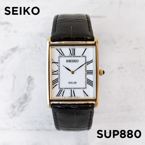 メンズにおすすめしたいセイコーの逆輸入モデルとして最後に紹介するのがセイコーSUP880で、革ベルトと四角形のケースから漂う品の良さと、ソーラー発電によるメンテナンス面における利便性が高く評価されています。