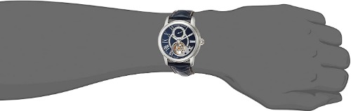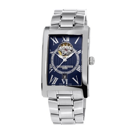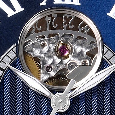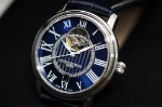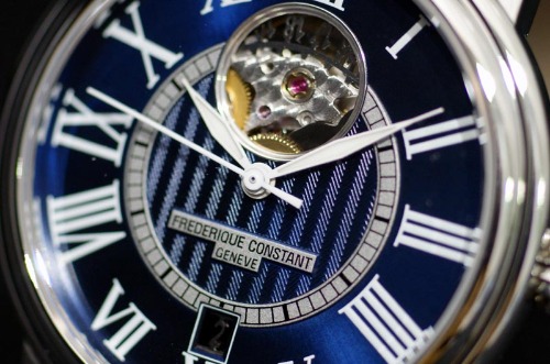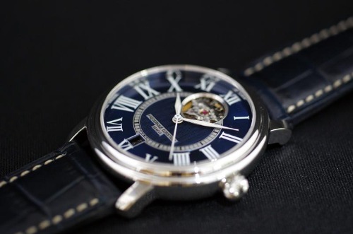 フレデリックコンスタントのハートビートマニュファクチュールは、ディープブルーの文字盤からムーブメントが見える構造が特徴です。