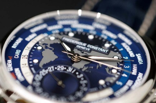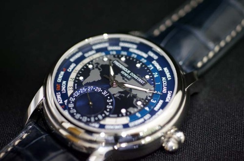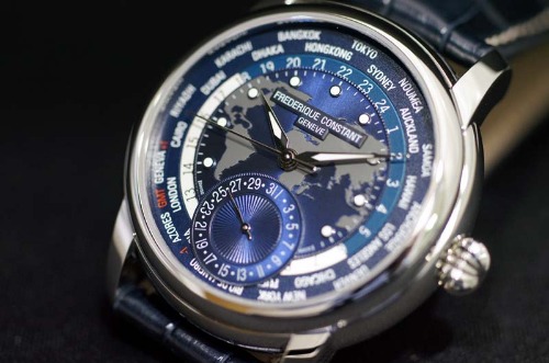世界地図を模したデザインの文字盤が個性的な、フレデリックコンスタントのワールドタイマーは竜頭の操作で指定した都市の時刻を合わせられるので、海外旅行や出張が多い人におすすめです。