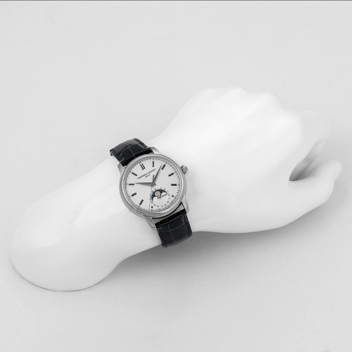 ムーンフェイズ搭載でもシンプルな文字盤に仕上げている、フレデリックコンスタントのムーンフェイズでモノトーンカラーがメインになりますのでフォーマルなシーンでも使えます。