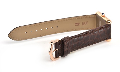 金無垢の時計には珍しく裏蓋にはステンレススチールを使用しており、珍しいコンビネーションで、革ベルトも使用されておりアンティークな雰囲気があるクオーツ時計です。