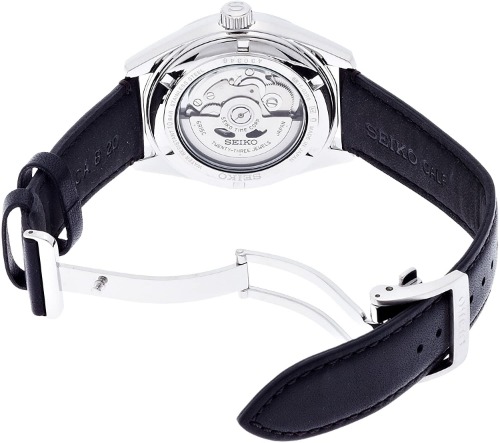 セイコーメカニカル「SARG011」は、シンプルなブラックレザーのベルトを使用しています。
