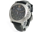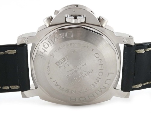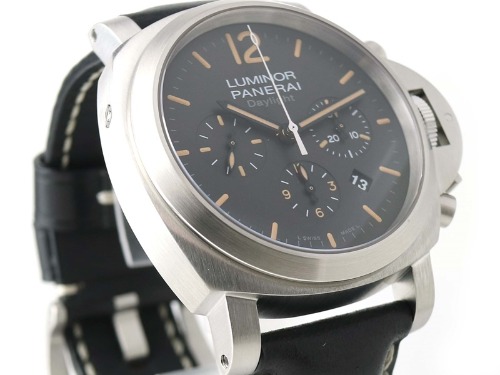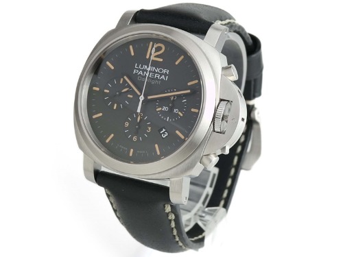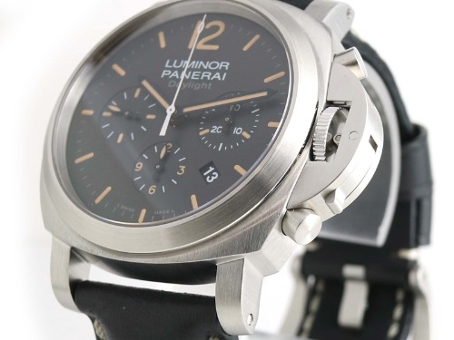 ケース径44mmに大きめのリューズガードが目を引くパネライのルミノールクロノグラフはミリタリーな雰囲気が特徴です。