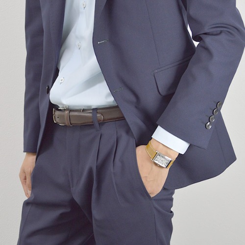 ラウンド型よりもシックに見えるレクタンギュラーでも、よりクラシカルに見せたい場合は革ベルトを選ぶと良いでしょう。