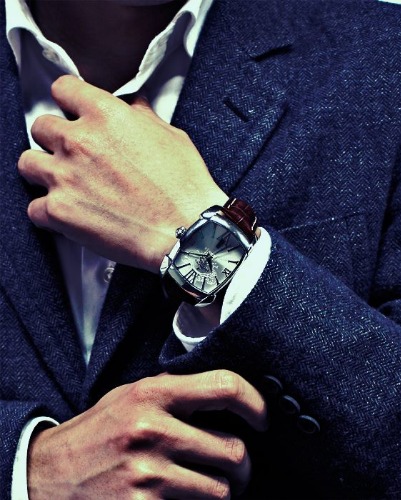 落ち着いた気品のあるトノー型の腕時計は、フォーマルはもちろんですがジャケットスタイルに似合いますのでかっちりした服装に合うスタイルの腕時計です。