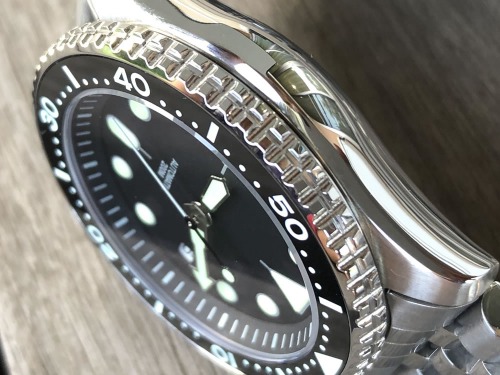 見た目はシンプルなダイバーズウォッチらしいデザインをしており、ブラックの文字盤にドットインデックスの組み合わせが視認性を高くしてくれます。