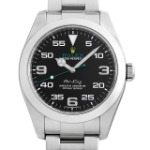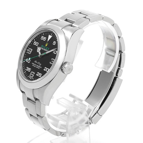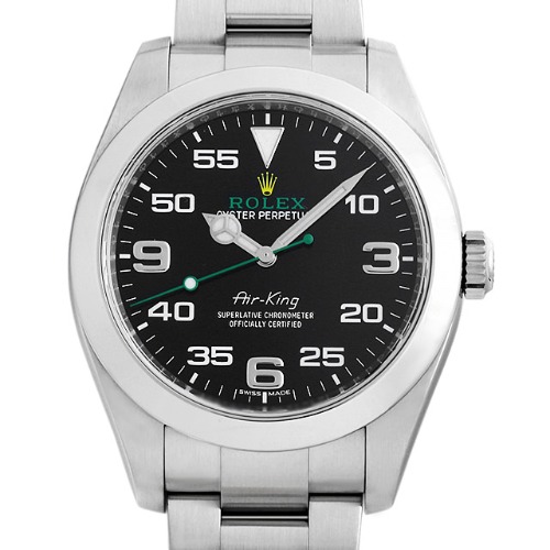 ロレックスメンズ エアキングの魅力は基本であるオイスターパーペチュアルの基本を受け継ぎながら、飛行時間を読み取るためにデザインされたミニッツスケールと黒の文字盤がとても腕に映えます。