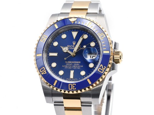 通称青サブといわれる逆回転防止ベゼルのデザインが印象的で、さらにコンビベルトとベゼルに18Kイエローゴールドを採用、高級感あふれるダイバーズウォッチに仕上がっています。
