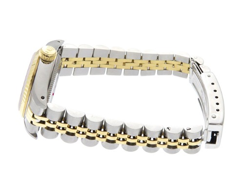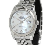 評価:長く使ってますが全然飽きないです。WGベゼルで10ポイントダイヤ、シェルダイヤルにジュビリーという組み合わせがシンプルですけど輝きがあって最高に好きです。フォーマルはバッチリ決まるし、カジュアルでも全然いいと思いますね。バンド交換したらガラッと雰囲気が変わる店も素敵です。万能時計です。