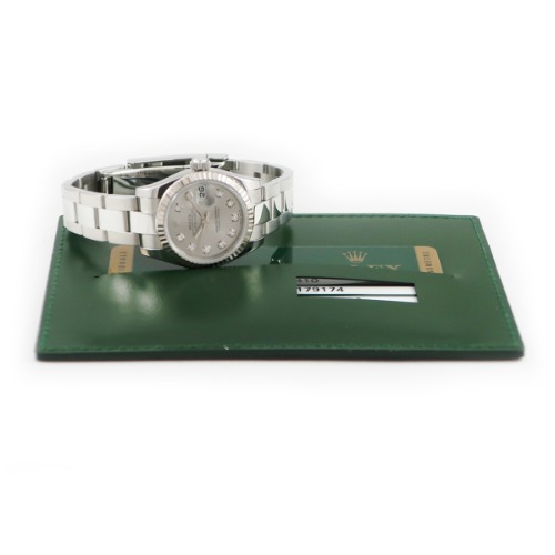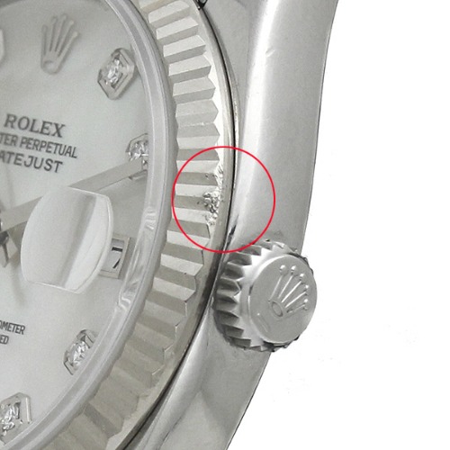デイトジャスト179174Gはオイスターケースとベルトが三連になっており、クラシカルな印象になっているのを10ポイントダイヤが華やかに彩っています。