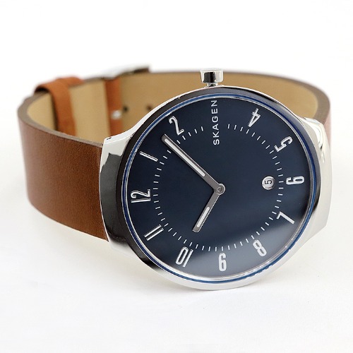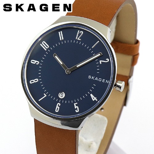 スカーゲンSKW6457は、紺色の文字盤にシルバーのローマ数字、6時の位置に小さくデイト表示される、モダンでシンプルな腕時計です。