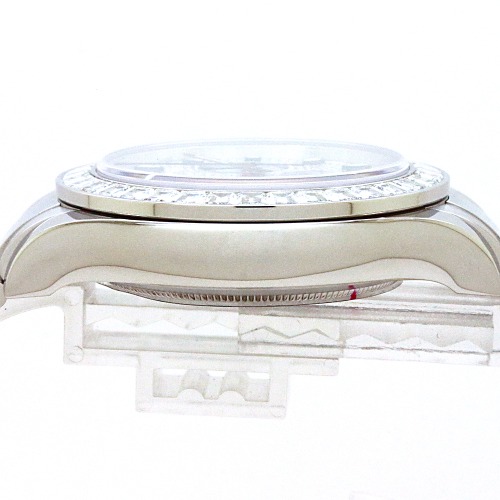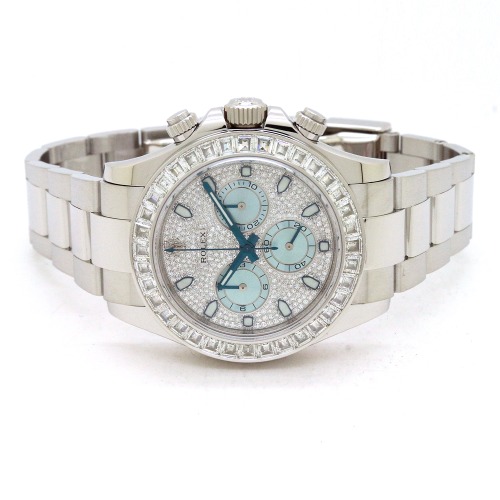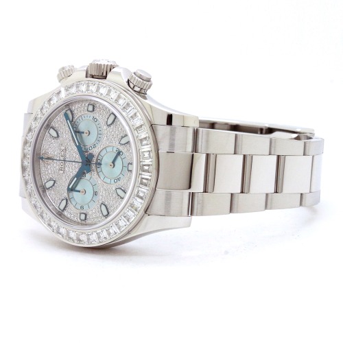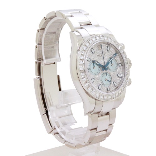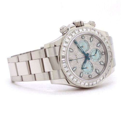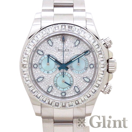 評価:プラチナなので重たいですが、AP、ロイヤルオーク、オフショア金無垢より軽いです。デイトナだと気付く人は少ないでしょう。女の子の受けは良くないです。何しろダイヤモンドだらけなので。でも着けていると充実の満足感が重みと共に伝わってきます。自己満足でも十分すぎるくらい豪華です。