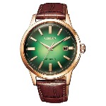 グラデーションがキレイなグリーンの文字盤にブラウンの革ベルトが、上品な印象を与えるでしょう。