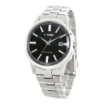 シックな黒の文字盤にステンレスのケースとベルトの腕時計は、どんなシーンでも着用できるでしょう。